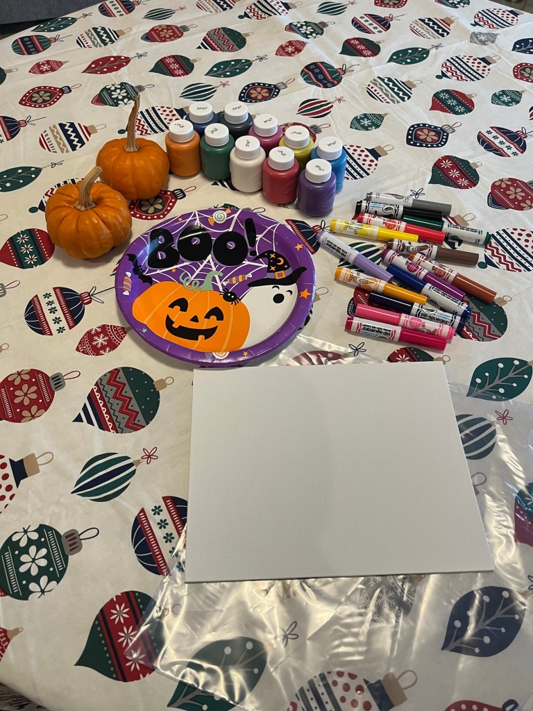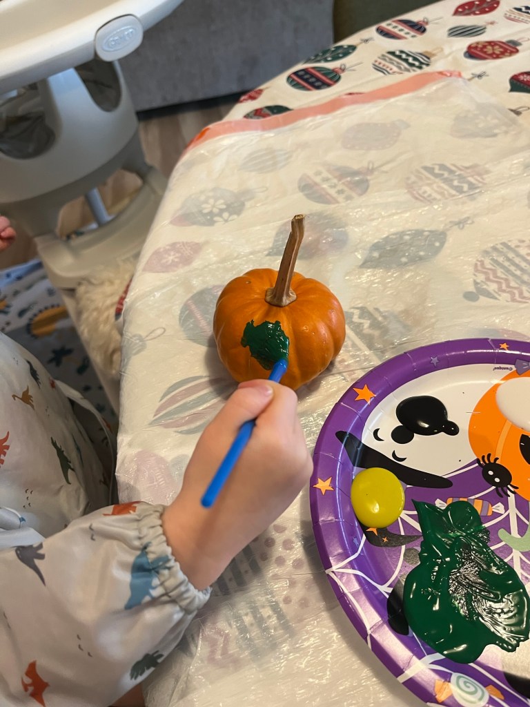 I squeezed a few dollops of washable paint onto a Halloween paper plate (think purple, green, and black, all the spooky colors!) for my two-year-old to use as his palette. He painted one pumpkin and tried coloring another with markers, but he was definitely more into painting. He kept asking for more colors, which made it even more fun and interactive.