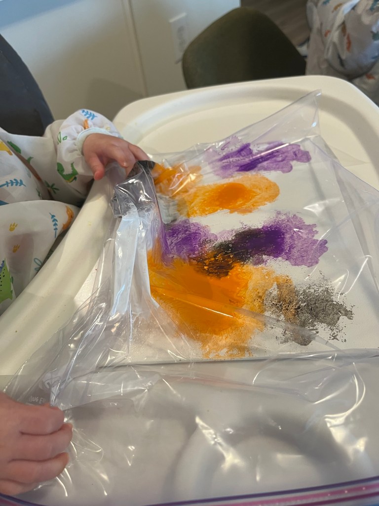 For my eight-month-old, I dolloped a few Halloween-colored paints directly onto the canvas and then sealed it inside a ziplock bag. I placed it on his high chair tray, and he went to town! He slapped, squished, and wiggled the paint around, and when we peeled the bag away we had this adorable, abstract little masterpiece.